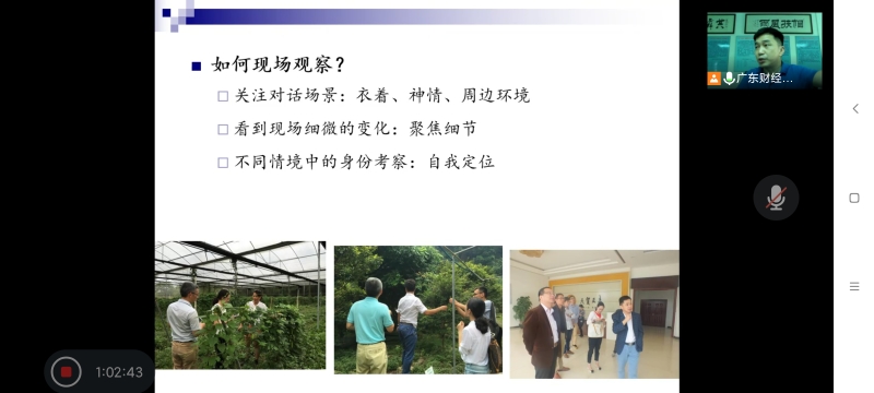 附:主讲人简介。王朝辉教授,华南理工大学管理科学与工程博士后,兼任香港浸会大学、云南财经大学等校客座教授。具有经济学、管理学与民族学多学科交叉学科背景,是国内公认的较早从事经济管理学实地调查的学者。他专注于原创性管理实践及理论研究,将规范的田野调查流程和质性数据分析方法引入到经济管理研究领域,在“现场实地”原始数据基础上建构本土化新理论。他还致力于实地调查方法在政府、企业管理实践应用和推广,从2015年起就在广西贺州等地创办实地调查基地,服务地方经济建设,被《中国社会科学报/网》《人民网》等中央及地方媒体广泛报道。
