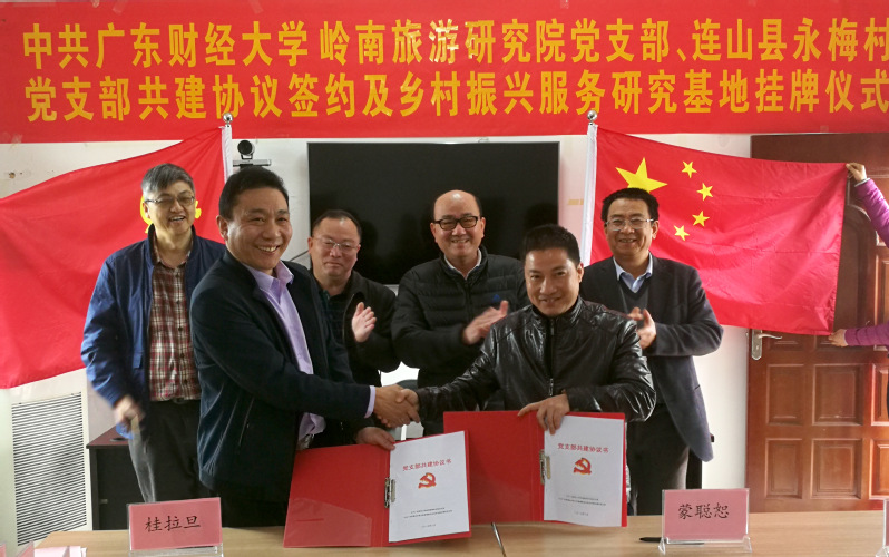2019年3月14日-15日,m88 app、旅游管理与规划设计研究院(下称研究院)与连山壮族瑶族自治县(下称连山县)永梅村党支部共建协议签订及“乡村振兴服务研究基地”挂牌仪式在连山县永梅村举行。学校党委书记黄晓波,党办、校办主任陈光团,发展规划处处长李俊、科长桑毅,研究院院长张伟强、党支部书记桂拉旦、刘少和、陆万俭,连山县委常委、宣传部长董儒坚,永和镇党委副书记、镇长孔庆勇,永梅村党支部书记蒙聪恕,蒙峒古村旅游公司董事长蒙美芹等参加活动。
