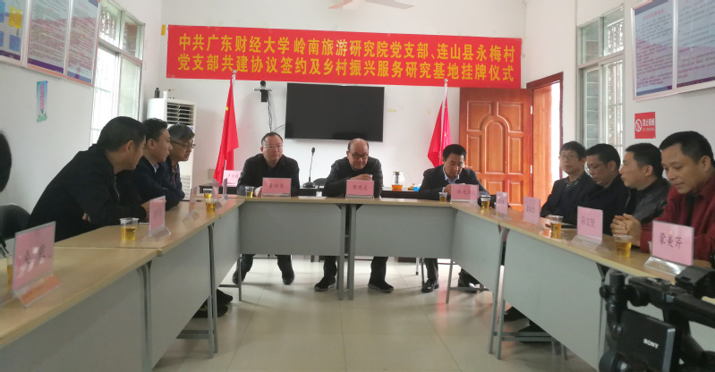 本次活动主要包括三项工作。一是为了贯彻落实党的十九大、习近平新时代中国特色社会主义思想、习近平总书记关于粤港澳大湾区重要论述、视察广东重要讲话、对广东重要指示批示等系列重要讲话精神,搭建党支部共建平台,积极推动党组织建设,激发党建队伍活力,充分发挥党组织的战斗堡垒作用和党员的先锋模范作用,坚持“共建组织、共抓队伍、共享资源、共谋发展”的原则,并且在学校党委、地理与旅游学院党委的指导下,研究院党支部与永梅村党支部签订了《党支部共建协议书》,此举措能够协助基层创建更加规范务实的党支部,并能有效指导基层党支部的各项党建工作。二是为了进一步落实研究院公益完成的《连山壮族瑶族自治县永和镇永梅村旅游发展规划(2018-2030)》(下称规划)实施,m88 app、院士专家工作站与永梅村开展进一步的合作,挂牌“村振兴服务研究基地”,全力指导永梅村发展旅游业,带动永梅村经济,全面推进精准扶贫、乡村振兴战略。三是针对我校与连山县建立全方位的战略合作,进行前期的协商沟通工作,也得到了连山县委书记杨慰宁,县委副书记、县长冯红云的高度评价和赞同,期待合作尽快落地。
