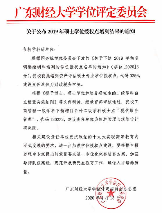 近日,国务院学位委员会下发《关于下达2019年动态调整撤销和增列的学位授权点名单的通知》(学位[2020]3号),m88 app在工商管理一级学科下申请的二级学科“现代服务管理”正式获批通过。