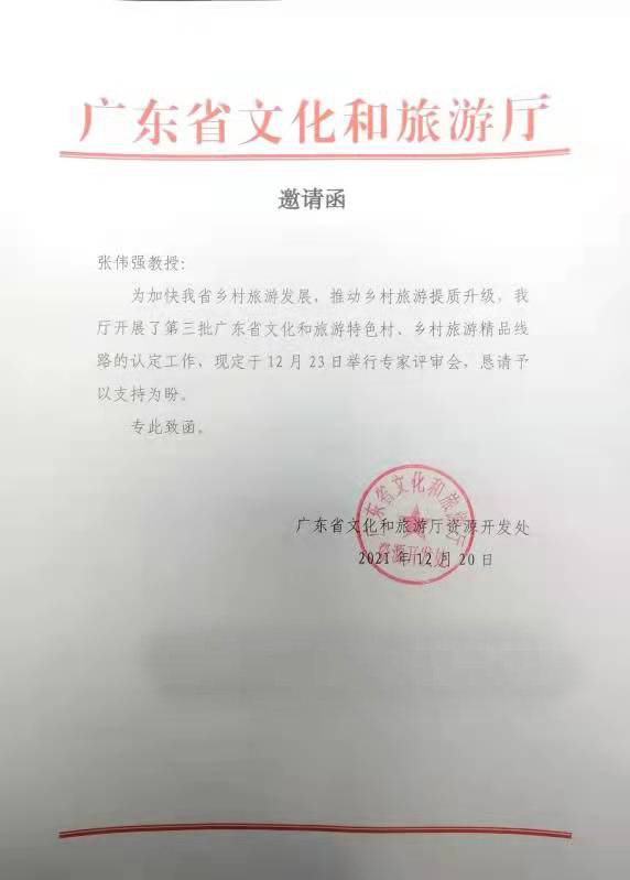12月23日,m88 app张伟强教授受邀参加第三批广东省文化和旅游特色村、乡村旅游精品线路专家评审会。