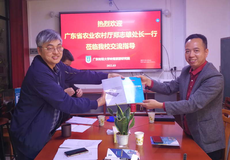 座谈会后,张伟强教授代表研究院向郑志雄处长一行赠与m88 app老师出版《旅游资源开发与管理》《粤北少数民族地区农户旅游扶贫感知研究》作为交流纪念。