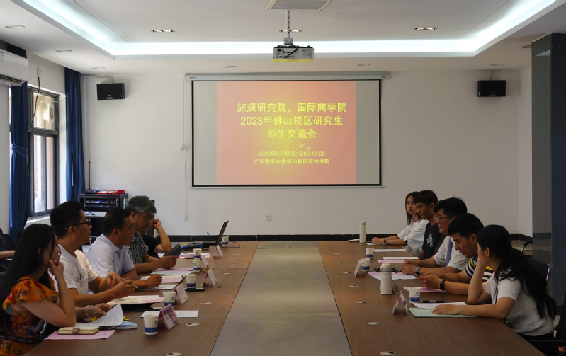 9月15日下午,m88 app副院长桂拉旦带队,张伟强、刘少和、曹梦甜、陆万俭及2022级研究生新生一行前往佛山校区国际商学院进行交流,国际商学院院长黄庆安、副院长彭中文、电商供应链系副主任侍颖及学院有意考研深造的本科生代表在有为书院会议室参加了交流会。黄庆安主持会议。
